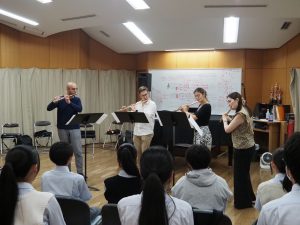 音楽教育の場に求められるのは「アクチュアリティ」と考えます。プロの音楽家、演奏家が舞台で放つあの緊張感が教室に必要です。その意味で今回の機会は生徒にとって良い演奏を聴くことに留まらず、真に音楽を学ぶことができる機会であったと思います。また、一流のフルート奏者を目の前にして抱いた憧れを原動力として生徒はさらに成長してくれるものと思います。ありがとうございました。